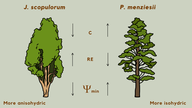 The image below illustrates the continuum of plant water regulation strategies, from more isohydric to more anisohydric behavior, by comparing key physiological traits and their influence on drought response. This image reinforces the idea that isohydry and anisohydry are not fixed categories, but part of a dynamic spectrum shaped by both environmental and evolutionary factors.
