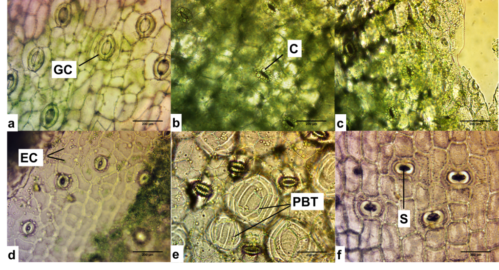 (a) Dendrobium kingianum with anomocytic stomata, (b) Guarianthe skinneri with anomocytic stomata, (c) Thrixspermum subulata with anomocytic stomata (d) Lophiaris silverarum with tetracytic stomata, (e) Vanilla planifola with anisocytic stomata, and (f) Rossioglossum ampliatum withanomocytic stomata.